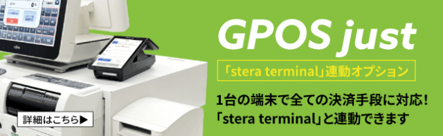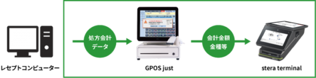 これは当社の薬局向けPOSレジ「GPOS just」と、三井住友カードが提供するオールインワン決済端末「stera terminal」の連動イメージです。