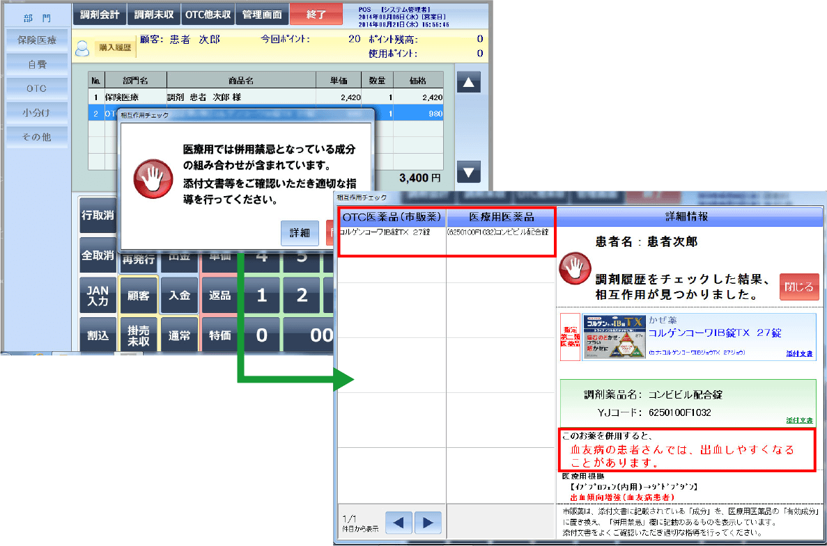 OTC医薬品の情報提供のサポートや、医療用医薬品とOTC医薬品の飲み合わせチェックまで行えるため、POSレジで充実した情報提供が可能です。