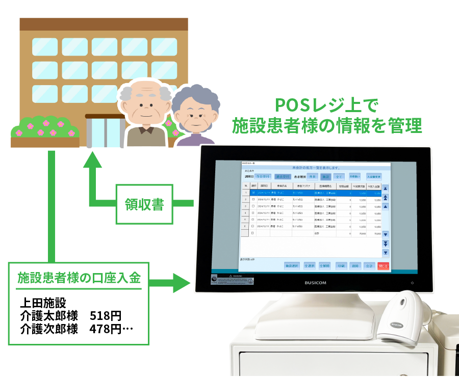 調剤窓口の患者様のお会計はもちろん、施設入所の患者様の会計もGPOS justなら簡単にできます。